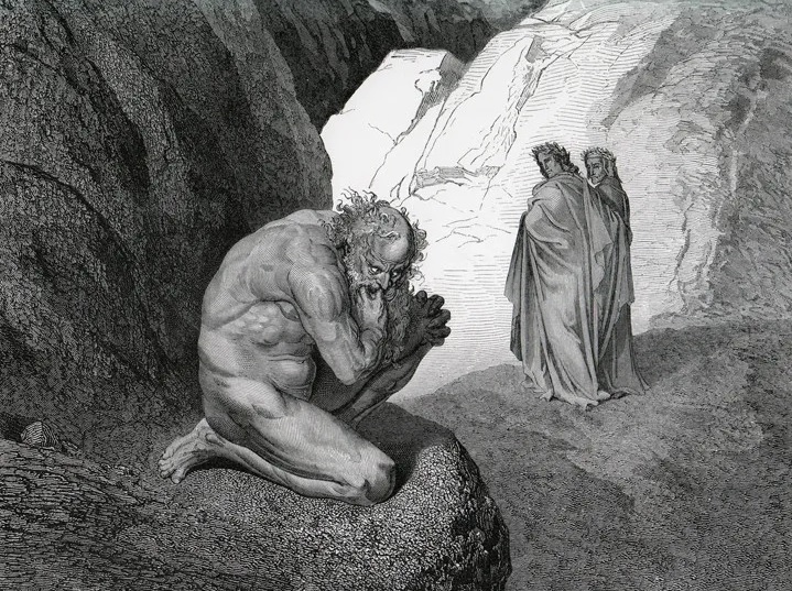[5] Los primeros tercetos del Canto VII de la Divina Comedia dicen así: «Pape Satàn, pape Satàn aleppe!, / cominciò Pluto con la voce chioccia; / e quel savio gentil, che tutto seppe, / disse per confortarmi: Non ti noccia / la tua paura; ché, poder ch’elli abbia, / non ci torrà lo scender questa roccia». / Poi si rivolse a quella ’nfiata labbia, / e disse: “Tacci, maladetto lupo! / consuma dentro te con la tua rabbia» (Alighieri, 2000, p. 61).